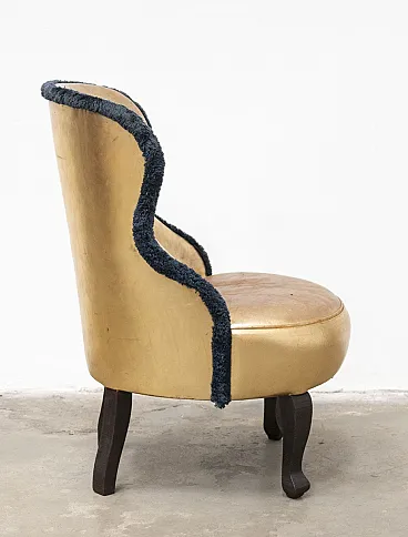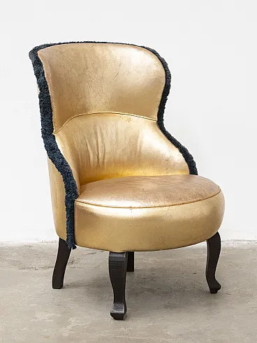 The upholstery is full-grain leather with a metallic finish, soft to the touch and of the highest quality. Specifically, the term used by Baxter for this particular color variant is often identified as "Gold Point" Leather. The profile is finished with elegant contrasting dark blue trimmings that emphasize the curved lines of the backrest.