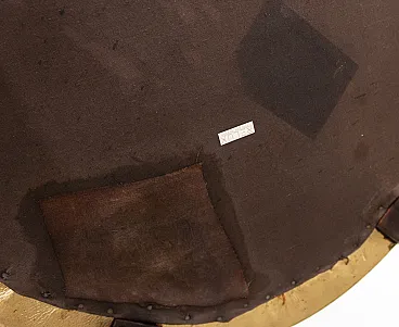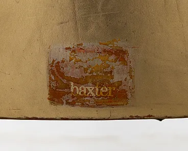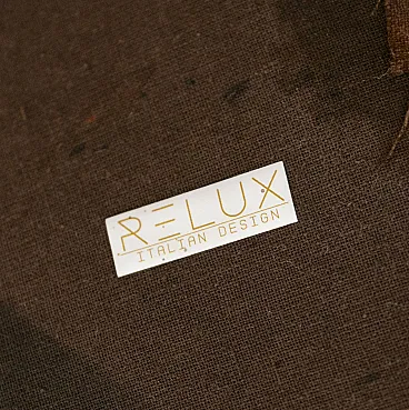 The armchair is used, in very good condition. The skin of the seat has some typical folds due to time that give it a worn appearance. Below is a small patch in the fabric. The structure is solid and intact and the Baxter brand and the Relux distributor label are present.