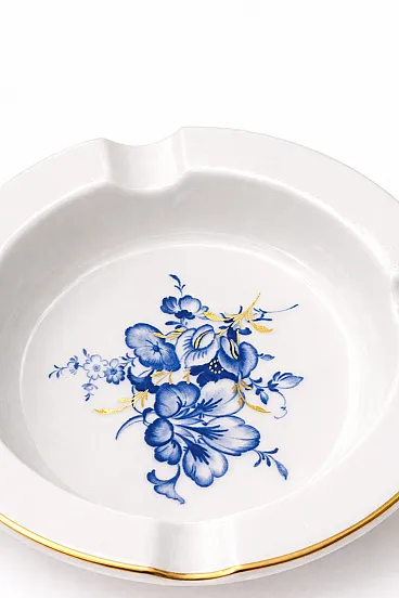 Elegant ashtray in authentic Meissen porcelain, characterized by a delicate blue floral motif and refined golden piping applied by hand.