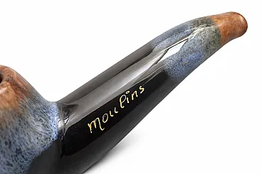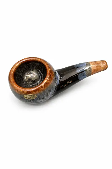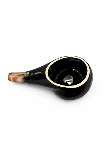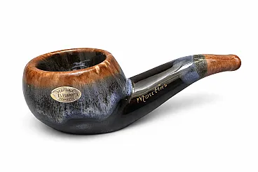 Refined sculptural ashtray in the shape of a pipe, made by the French manufacturer Moulin's. Made in Grès Flammé (Grand Feu), a very high temperature firing technique that gives the ceramic exceptional resistance and dynamic glazing. The decoration, characterized by organic shades that range from earthy brown to cobalt blue, makes this piece a unique example of mid-twentieth century French art pottery.