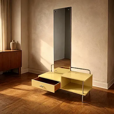 Manufactured in wood, metal, and glass with chrome detailing, the structure includes a mirror and built-in compartments. The surfaces show a consistent vintage patina with light wear and minor marks consistent with age. The piece remains structurally sound and original.
