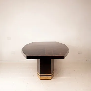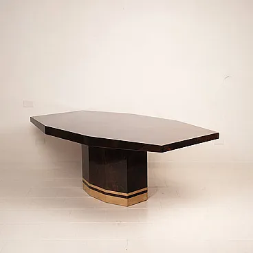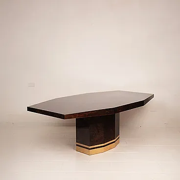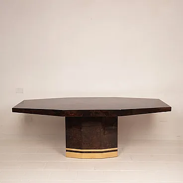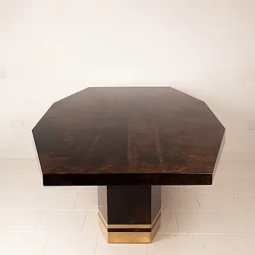 The chamfered, massive, geometric octagonal top is clad in worked and dyed natural parchment in a deep brown tone, with those organic, almost cosmic marblings that are the unmistakable signature of the Tura manufacture.