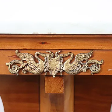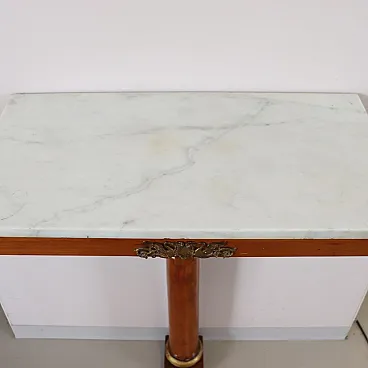 Made of cherry wood with a linear design typical of the Empire period, it features an exquisite white marble top (probably from Carrara) supported by an elegant central column. On the front, a finely chiseled gilt bronze decoration creates a distinctive visual accent. The numerous photos also show the construction details that attest to its historical era.