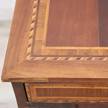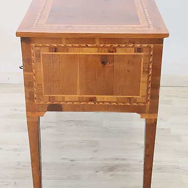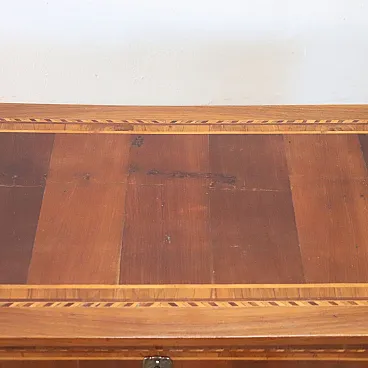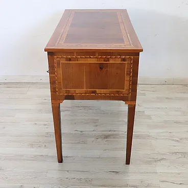 Characterized by a typical design inspired by the sumptuous Louis XVI era, it features clean lines and rich geometric inlays. The refined inlays, made with different essences of fine wood, cover the entire desk, creating a unique visual accent. This decoration is rich without being excessive, extremely elegant. The front has three practical drawers for storing objects. The wooden top has comfortable dimensions for working. Note that the back is not finished or decorated, so this desk is designed to be placed against a wall. Consider that the height from floor to band has an available legroom of 62 cm.