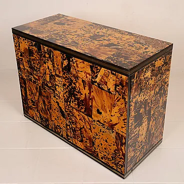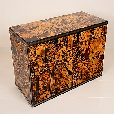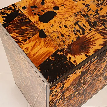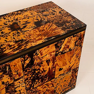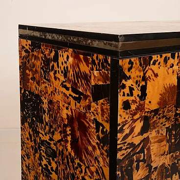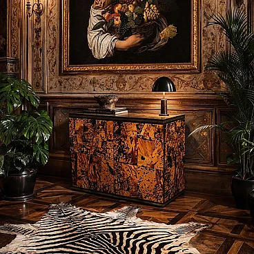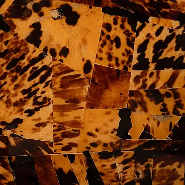 Made of genuine tortoiseshell, worked in fragments and recomposed into a patchwork surface of extraordinary visual intensity, this cabinet is an organic explosion of texture, depth, and light. Each element is unique, and every chromatic variation, from warm honey to deep brown to absolute black, creates a vibrant, almost animal-like visual rhythm that is impossible to imitate.