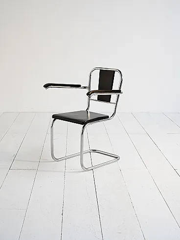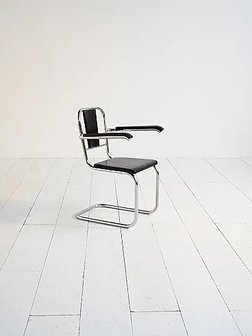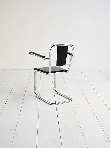 Modernist chair of Scandinavian production dating back to the 1930s, an expression of European research linked to the cantilever typology developed in the Bauhaus context. The chromed tubular steel structure develops in a continuous sled line, defining a balance between visual lightness and technical innovation. The black covering of the seat and backrest introduces an essential contrast, while the integrated armrests underline the formal rigor typical of the period. An example of the spread of modernist language in Northern Europe, in dialogue with the experiences of Mart Stam and Mies van der Rohe.