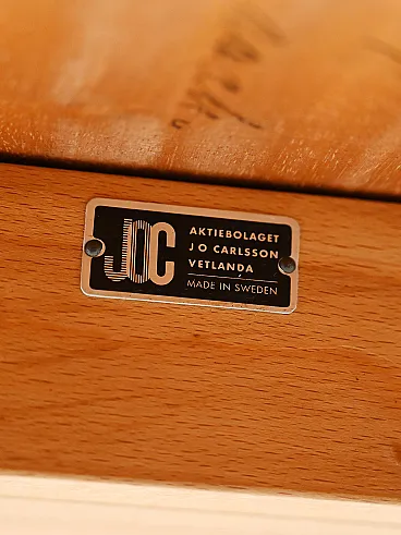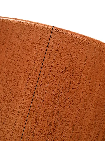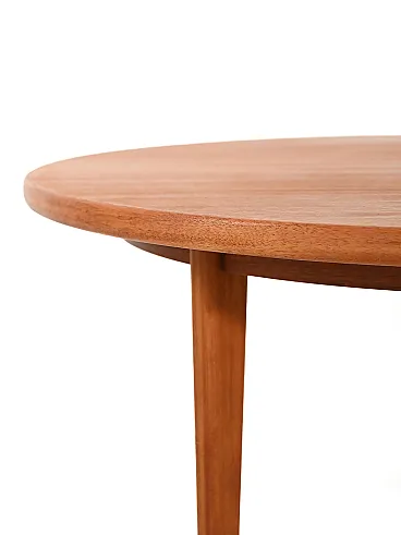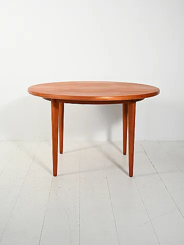 Elegant round extendable teak table produced in the 1960s by the Swedish manufacturer J.O. Carlsson of Vetlanda, as indicated by the original mark applied under the top. Equipped with two extensions, the table can be extended up to 220 cm, maintaining aesthetic and functional continuity. The J.O. company Carlsson Vetlanda was one of the production companies active in Småland during the post-World War II period, an area famous for its cabinet-making tradition and for the diffusion of modern Swedish design. The production stood out for the careful use of teak and for furniture with an essential language, designed to combine construction quality and daily functionality according to the principles of Nordic modernism.