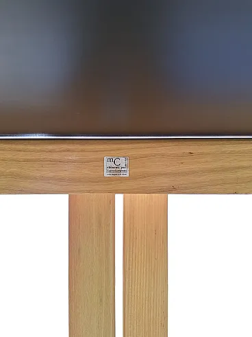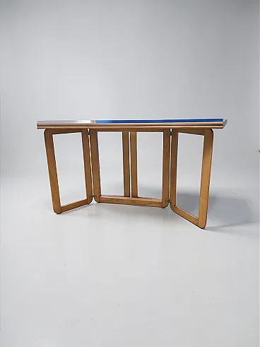 Table designed by Giovanni Offredi and produced by MC Selvini, 1970s. Excellent as a freestanding table, a desk, or against a wall, it can be used at its full width, with a depth of 64 cm, or as a console table with the top folded. Depth when folded: 35 cm. The frame folds completely, making it nearly flat when closed. It has no defects but may show minor signs of wear, such as some small scratches on the wood.