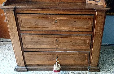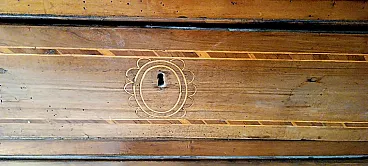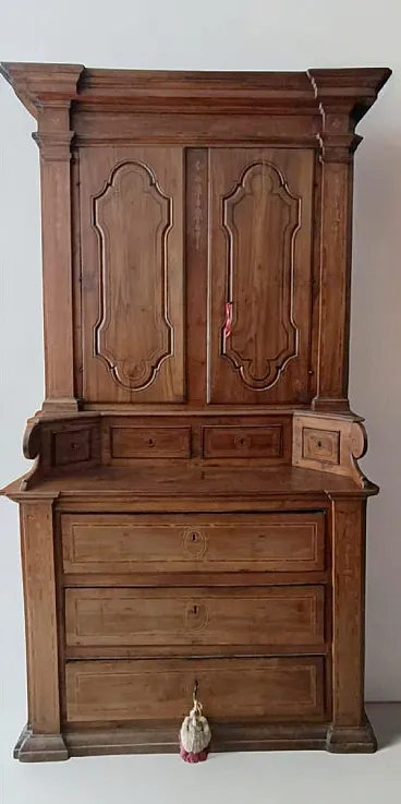 The furniture depicted is a sacristy sideboard with a shelf, two upper doors inlaid with geometric patterns and a lower section with four small inlaid drawers and three larger drawers. Made of solid walnut and dating back to the 18th century, it comes from central Italy (Lazio, Marche or Abruzzo).