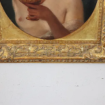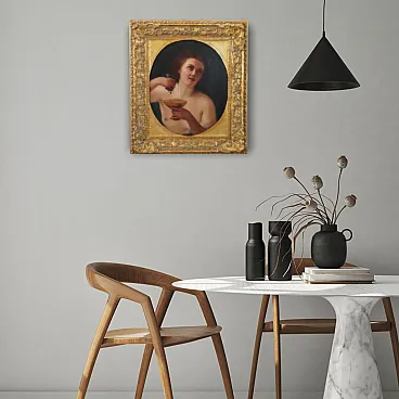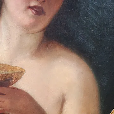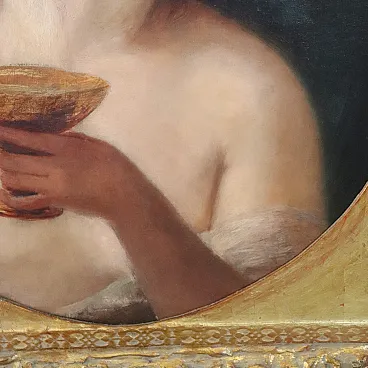This nineteenth-century painting portrays a female figure holding a cup and a bunch of grapes. These details allow us to identify the figure as a Maenad. In Greek mythology, the Maenads were the followers of the god Dionysus (god of ecstasy, wine and the liberation of the senses). The painting is characterized by a style that recalls classical portraiture. The composition and use of light suggest a typical 19th century academic influence. The painting quality is excellent, with delicate brushstrokes and subtle shading.
