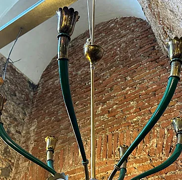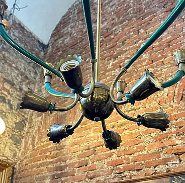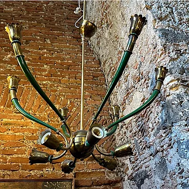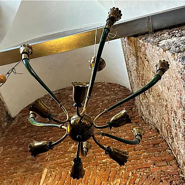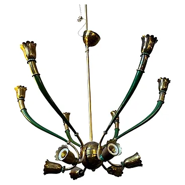 A green metal and brass chandelier designed and manufactured in Italy in the Sixties in the manner of Stilnovo, it's in good condition overall and in working order, brass is in original patina. The design is characteristic of Italian craftsmanship from that era. The chandelier features 10 arms extending outward and upward from a central brass sphere, each arm ending in a brass light fixture. The arms are predominantly green metal, contrasting with the brass accents at the joints and light fixtures. The overall design combines sleek lines and bold curves, typical of the Mid-Century Modern style. Stilnovo was probably the most important chandelier factory in Italy of the period and influenced the whole Italian lighting production, with Stilnovo collaborated the most important designers of the mid-century