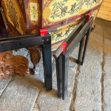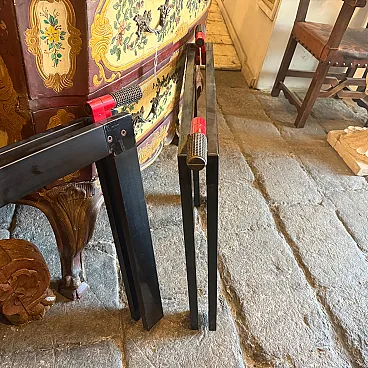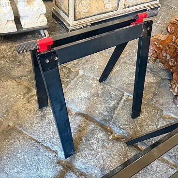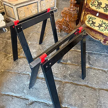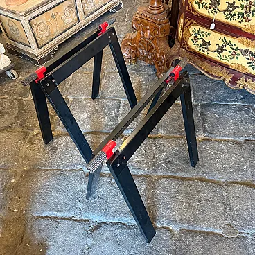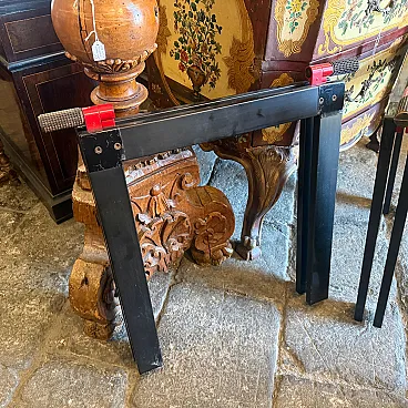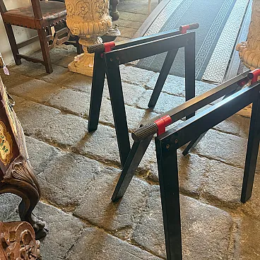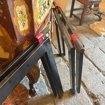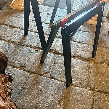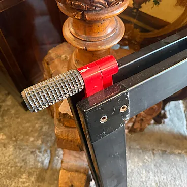 This sophisticated set of two vintage easels represents a quintessential collaboration between the visionary Italian architect Gae Aulenti and the renowned manufacturer Zanotta during the 1970s. Characterized by a minimalist yet industrial aesthetic, each easel features a sleek, angular frame finished in a deep black lacquer that highlights the geometric precision of the design. The structural integrity is paired with Aulenti's signature playfulness, seen in the vibrant red mechanical joints and textured grey rubber grips at the apex. These functional details allow the easels to be adjusted or folded with ease while providing a striking color contrast that embodies the bold spirit of late 20th-century Italian modernism. Whether used to display large-scale canvases or as standalone sculptural objects, these pieces serve as a testament to the era's ability to elevate utilitarian workshop equipment into high-end gallery furniture. Their sturdy silhouette and preserved original hardware make them a rare find for collectors of iconic European design, seamlessly blending architectural rigor with a pop-art sensibility. We have the rectangular glass top, it'snt on the list because shipping is more expensive to make it.