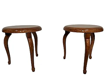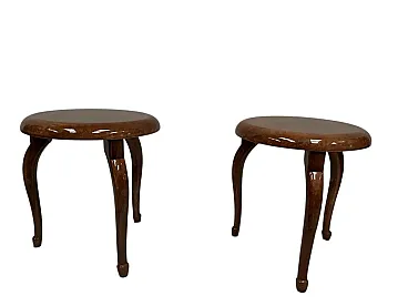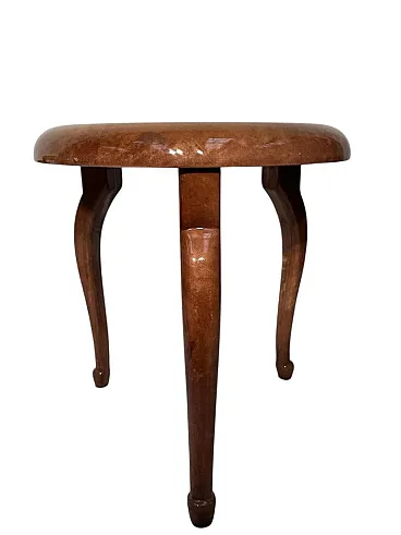 Pair of parchment stools attributed to Aldo Tura, a refined example of post-war Italian design. The stools have a round seat covered in natural parchment, with a warm amber shade and a shiny surface that enhances the irregular veins, typical of this precious material. The curved, slender and elegant legs are also covered in parchment, creating continuity between structure and seat. Attributable to the production of Aldo Tura, known for the innovative use of parchment applied to furniture. Overall, these are decorative and functional pieces at the same time, ideal as stools, or small tables, capable of adding a sophisticated and sculptural touch to any environment. Aldo Tura (Milan, 1909 – 1963) was an Italian designer and manufacturer of furniture and furnishing objects known above all for his unique, elegant and highly sought-after artisanal style in mid-century Italian design. In 1939 he founded his furniture workshop/company in Lombardy, near Milan. In the 1930s and especially after the Second World War he began producing luxury furniture, lamps and accessories, combining influences from Art Deco, Art Nouveau and modernism. Tura became famous for the use of “exotic” and unconventional materials such as parchment, eggshells, lacquered goatskin, precious woods and shiny metals. He always preferred artisanal and refined production, avoiding mass production: this makes his pieces rare and highly sought after on the vintage and design market. Some of his works have entered the collections of the Brooklyn Museum in New York, originating from the traveling exhibition Italy at Work: Her Renaissance in Design Today (1950-53). In summary, Aldo Tura is considered one of the most original and singular Italian designers of the post-war period, capable of combining elegance, craftsmanship and a distinctive style in the panorama of mid-century design.