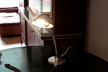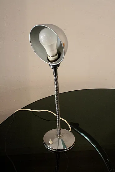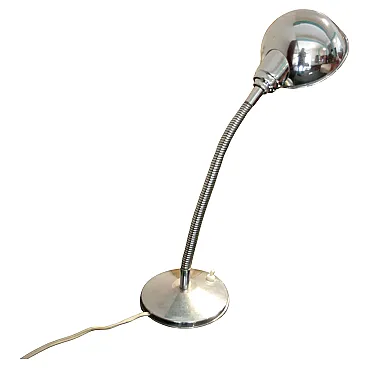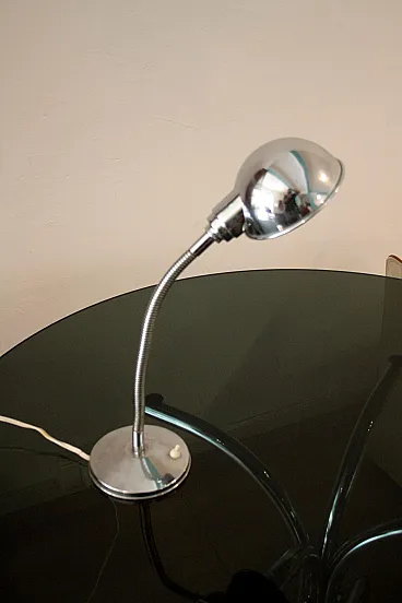 Vintage 1960s table lamp, chrome metal, round base with cast iron weight and flexible/swivel neck. In all likelihood it was used as a workshop lamp, placed on a worker's or craftsman's work table. Material: chrome-plated metal. Provenance: Made in Italy (prob.) Good condition, with signs of wear and patina of time that was intended to be maintained in part. Functioning with original cables. Bulb socket E27 European plug. Its essential style and ergonomic design make it suitable for furnishing desks and reading tables. Please note: this is a "vintage" item with its own past and history. Having already been used, it may show traces of use and the passage of time. What is usually called "patina" and characterizes vintage objects. The pictures and description serve to better clarify the state of preservation. Dimensions width 14 cm by depth 14 cm, height 50 cm