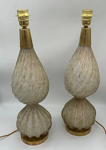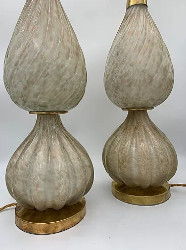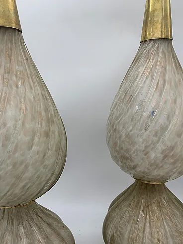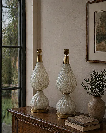 The body is made of worked glass, with an opaline and marbled finish in shades of beige, cream and light amber shades. The surface has light wavy grain and internal reflections, which would give a very warm and diffuse effect when lit.