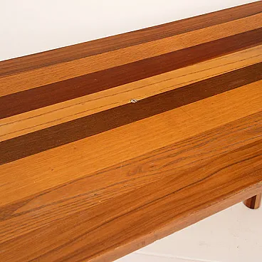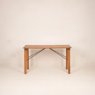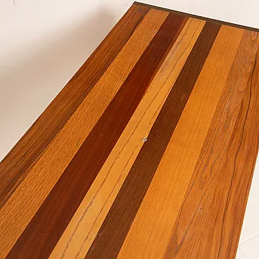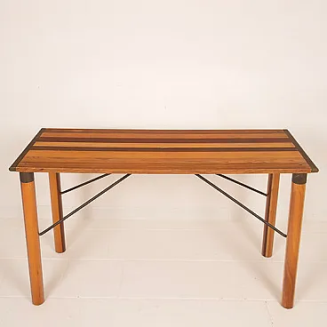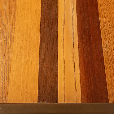 The top is made of combined woods of different essences, selected to create a natural and calibrated chromatic alternation, which is not decorative for its own sake but emphasizes the linear design of the object.