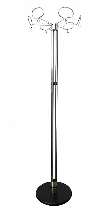 Minimalist clothes hanger Space Age 70s of Italian manufacture produced by Valenti Luce tubular chrome-plated steel structure, base support in cast PVC, perfect chroming. Base diameter cm 35