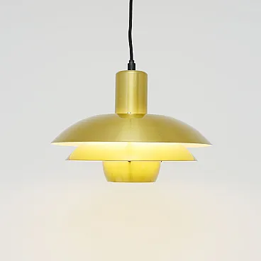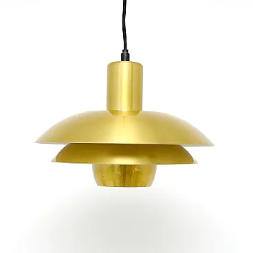 Beautiful golden lamp designed based on the principle of a reflective shadow system, which directs light not only downwards but also to the sides, so the light not only illuminates the space but also brightens the lamp itself. Classic Scandinavian lines and a universal form that works in any interior. Dating: 1970s. Condition: Vintage, very good, minor signs of age in the form of minimal surface scratches, cable length about 150 cm. The lamp has been thoroughly cleaned. Dimensions: 18 (height) X 30 (diameter) [cm].