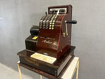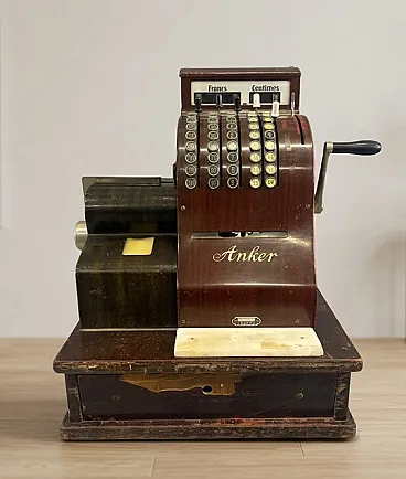 This is an original mechanical cash register by Anker, dating to the 1920s, produced for the European market as indicated by the francs and centimes layout. Designed for manual operation, it reflects the engineering and aesthetic of early 20th-century commercial equipment.