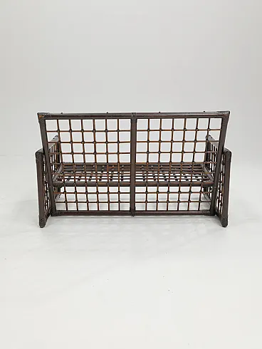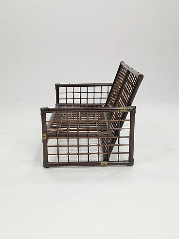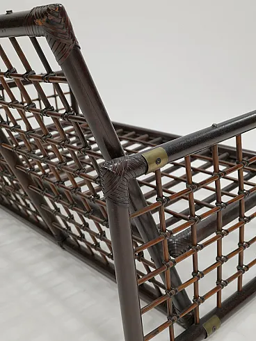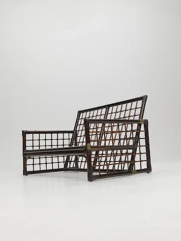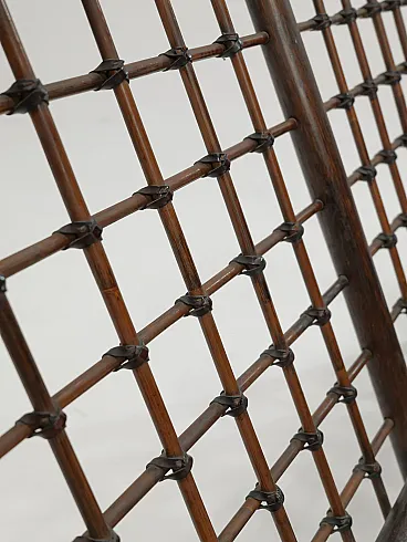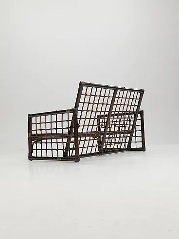 The Basilian furniture series, designed in the early 1970s by Italian architects Afra and Tobia Scarpa for B&B Italia - Compagnia delle Filippine division, features a distinctive structure made of bamboo panels with a woven lattice of leather strips. This intricate design creates a unique decorative effect, blending natural materials with a sophisticated, modern aesthetic. The series reflects the Scarpa's innovative approach to craftsmanship and functionality, making it a timeless piece of design history.