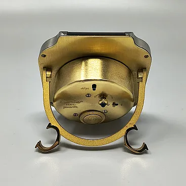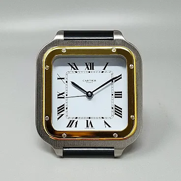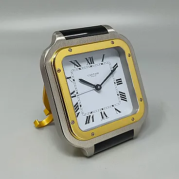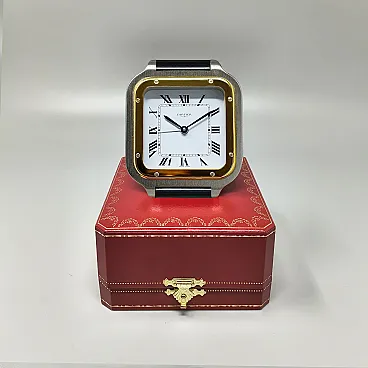 Questa splendida sveglia Cartier Santos Pendulette degli anni '80 rappresenta un sofisticato mix di design funzionale e lusso senza tempo. Prodotto in Svizzera, questo pezzo è dotato di un movimento al quarzo svizzero ad alta precisione, che garantisce una misurazione del tempo affidabile e precisa. Il design mette in mostra l'iconica lunetta placcata in oro 18 carati e le caratteristiche viti a vista che definiscono la leggendaria estetica Santos. Il quadrante dell'orologio è composto da un brillante quadrante in smalto bianco incastonato con tradizionali numeri romani neri ed eleganti lancette a forma di spada. In particolare, questo modello è rifinito in un sorprendente colore nero, eccezionalmente raro da trovare oggi sul mercato, il che lo rende un vero e proprio premio per i collezionisti. La cassa dell'orologio è meticolosamente numerata 7508 03279, garantendo il suo posto come autentico orologio Cartier vintage. Rimane in ottime condizioni e continua a funzionare perfettamente, mantenendo gli elevati standard dell'artigianato svizzero. Questo oggetto da collezione è accompagnato dalla sua custodia di presentazione originale, rivestita in ricca pelle rossa, nonché dalle istruzioni originali per l'uso. Si tratta di una rara opportunità di possedere un set vintage completo di una delle maison più prestigiose al mondo. È un compagno di viaggio funzionale e un'aggiunta maestosa a qualsiasi scrivania o comodino.