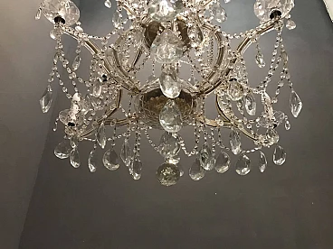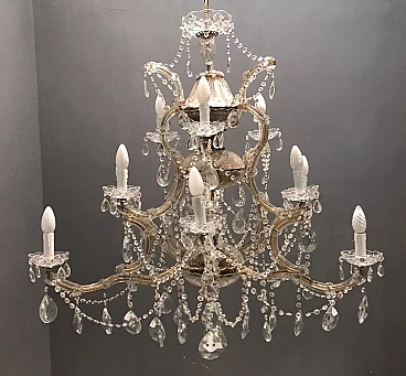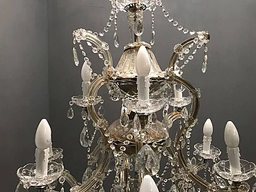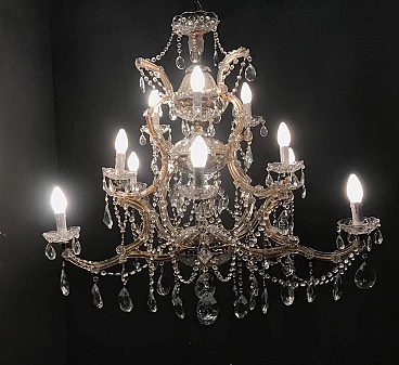 Large Murano glass in Marie Therese style. This chandelier has been stripped down of each piece of glass, removed and cleaned and then placed back on using the hand-knotted method. New wiring, 10 E14 lights. Height without chain and ceiling canopy: 100 cm.