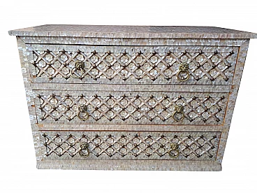 Pair of nightstands and chest of drawers covered in mother of pearl