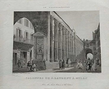 Luigi Cherbuin (Basel 1810 - Milan 1875) was an important etcher and designer active mainly in Milan. Author of a large number of views was the main illustrator of the Album Exhibition of Fine Arts in Milan. This album was published annually from 1839 to 1861 first by Carlo Canadelli and then by Giuliano Canadelli e C., in the form of a strenna with plates depicting the works exhibited annually at the Academy of Fine Arts of Brera. He was a skilled and careful vedutista capable of capturing the beauty of everyday life both by engraving his own inventions and reproducing paintings or photographs of other authors. In this regard, it is worth remembering the series of views of Milan and elsewhere for a total of 119 plates from Daguerreotype, the first example of the use of photography as a model for engravings. In this print, part of the Daguerreotype series, is represented a view of Milan, one of the rare surviving views of imperial Milan. What we see is a representation of the colonnade of San Lorenzo before the demolitions that involved the surrounding buildings in 1935. In fact, between the 16 marble columns seven meters high with Corinthian capitals and the Basilica, you can see a section of the group of houses that occupied the current churchyard. The composition is lively with people in the street caught in different poses and attitudes: there are those who pray kneeling in front of a large votive aedicule with the image of Christ, those who look out from the liquor store on the left, and those who meet and stroll: a priest, an agent, a woman in the costume of Brianza, a seller of images and ribbons ... Delicate chiaroscuro contrasts suggest a sunny day and create a silvery light that invades the scene. Below the image, engraved title author and publisher Ferdinando Artaria and son. Excellent impression. Excellent state of preservation. Wide margins beyond the beat of the copper. Dry stamp on the left: Artaria. Another copy is kept in Milan (MI), Civic Graphic and Photographic Collections. Civic Collection of Prints Achille Bertarelli Bibliography: P. Arrigoni (edited by) Milano nelle vecchie stampe, n.193