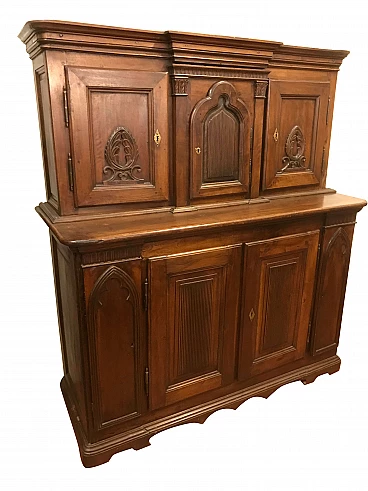 Beautiful and rare Piedmontese Sacristy piece in solid walnut dating back to the late 18th century of a beautiful size (smaller given the type of furniture) that suggest a private use of the same. It can be divided into two pieces, with the upper part with 3 doors, two at the sides with a panel with carved laurel and a central one with neo-gothic motif, and the lower part with 4 doors, two larger at the center with "grissini" panels that recall the panel of the upper central door and two smaller at the sides with neo-gothic motif that recalls the upper central door. Present all 7 original locks, is in a state of exceptional preservation given the era, with all the ancient nailing is visible in the outer part and in the axes (all original) of the back. The upper part measures cm. 146x31x h 70