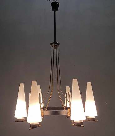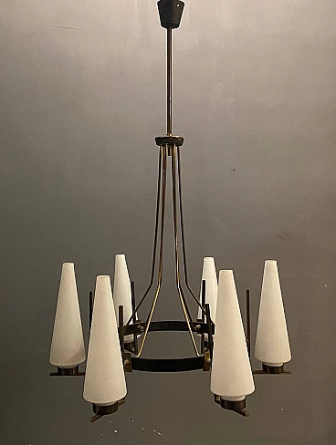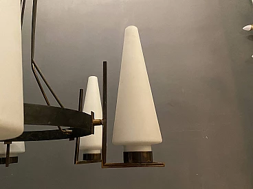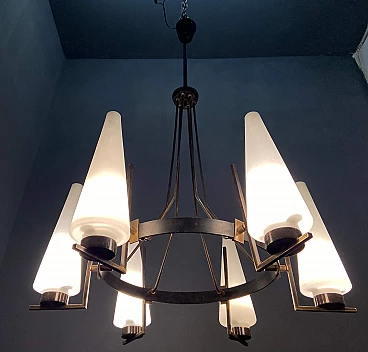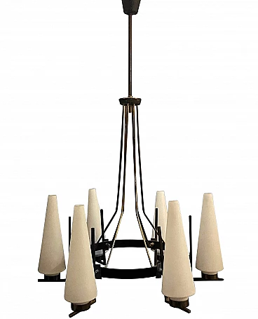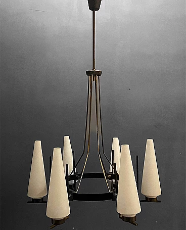 Stilnovo chandelier in bronze opal glass from the 1950s. Metal and bronze frame with white opal glass shades. It has 6 lights. Requires E14 bulbs.