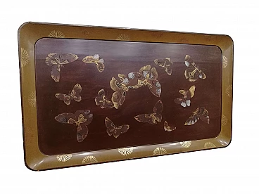 Elegant tray from the early 1900s, in lacquered and painted wood. Very refined decoration: butterflies in shades of brown, enriched with gold and blue / light blue details. Japan, early 20th century Conditions: small chips along the edges due to use and age Measurements: 70.5 x 41.5 cm