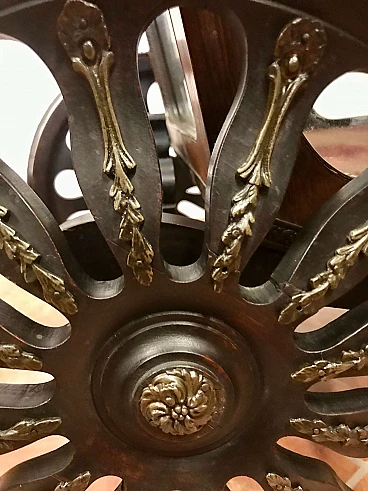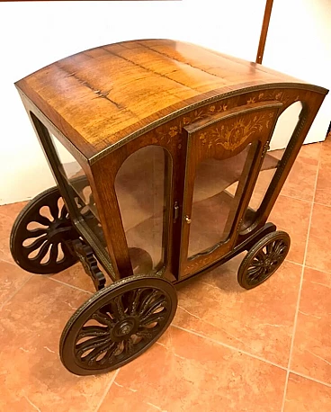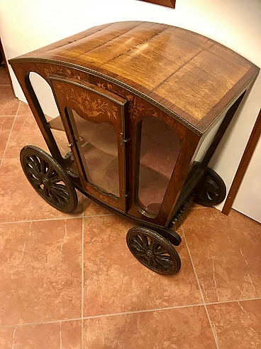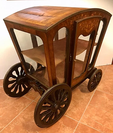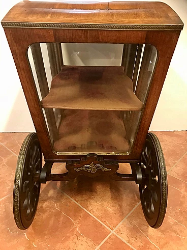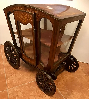 Extremely rare display cabinet in the shape of a carriage veneered in rosewood rich in bronzes, threaded and inlaid in maple. Although it is finished in the center, with floral inlays on both sides, on the facade it opens through a door with a knob that also acts as a latch and when removed it does not allow opening. On the upper door there is, inlaid, a noble coat of arms with a 7-pointed crown and a lily in the center. Easily born as a silver holder, it can be used to display collections with its 2 shelves. The state of conservation is very good, no Bronze is missing and, if desired, needs polishing and the replacement of the 2 shelves. Signs of time can be seen on the “roof” of the carriage, as can be seen from the photos. Being an unusual and never seen object, it is difficult to say exactly whether the manufacture is French or Italian (Florentine, Sicilian, ...). The 4 wheels (2 large and 2 small) are obviously fixed.