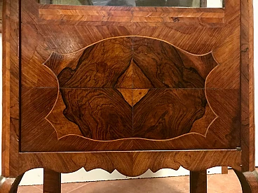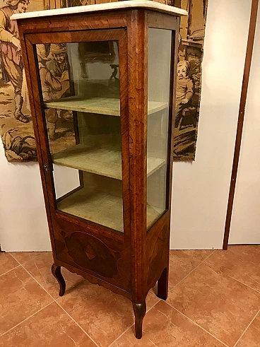 Beautiful Showcase from the Louis XV / Louis XVI transition period, second half of the 18th century, of a nice size, with one door, with escutcheon, lock and original key. Veneered in Walnut and Bois de Rose, it has three panels at the bottom with a maple fillet that encloses a walnut root forming a beautiful design. The front feet have a rounded corner veneered in Bronze. The lining is original like the 3 glasses which are blown. The original top is in white Carrara marble. The general state of conservation is very good, the cabinet is healthy with inevitable signs of aging. The internal fabric to be replaced.