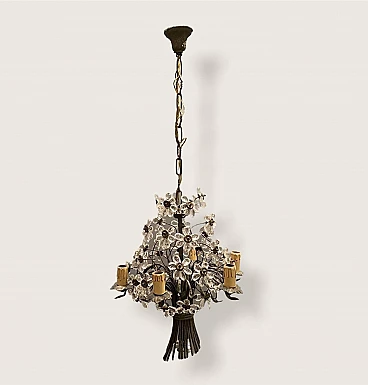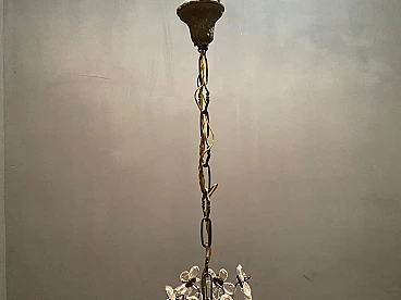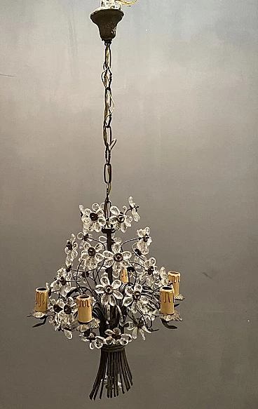 Crystal flowers on a bronze frame that presents a beautiful patina due to age. Height without chain and ceiling canopy: 55 cm. Requires 6 E14 light bulbs. New wiring compatible with UK, Europe and US.