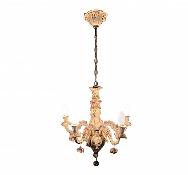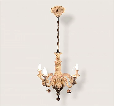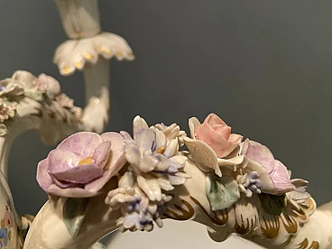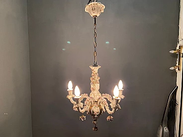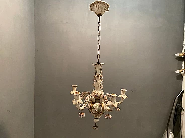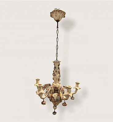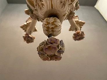 Chandelier in hand crafted Capodimonte porcelain with hand painted porcelain flowers. Height without chain and ceiling canopy: 52 cm. Requires 5 E14 light bulbs. Wiring compatible with UK and Europe.