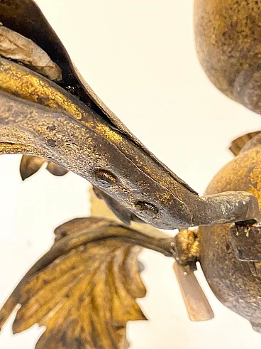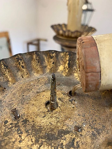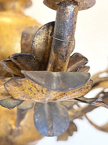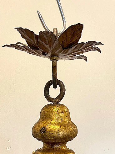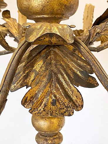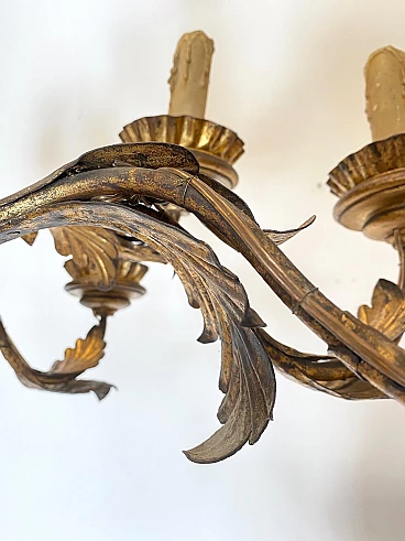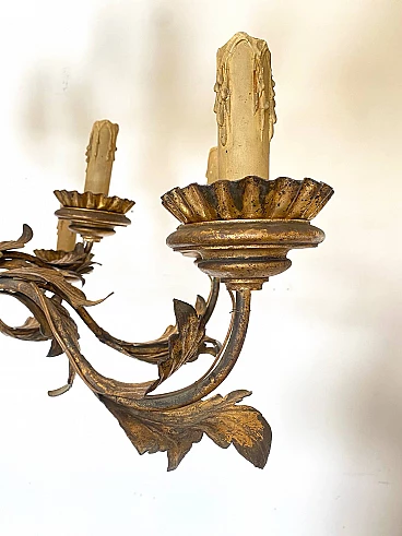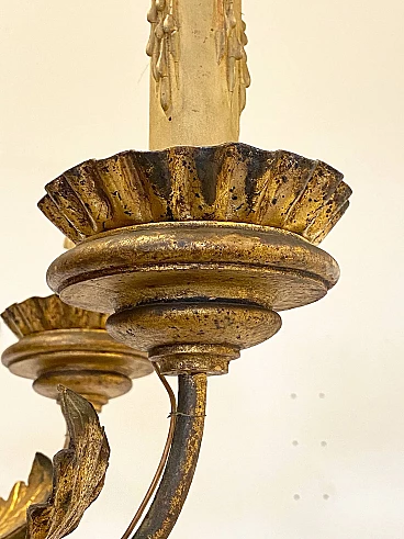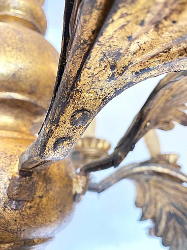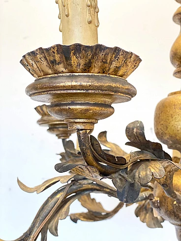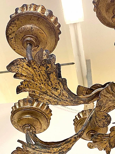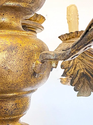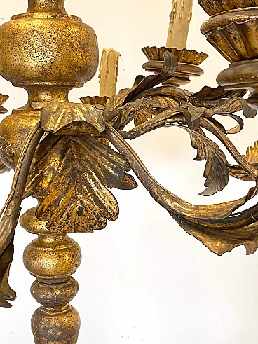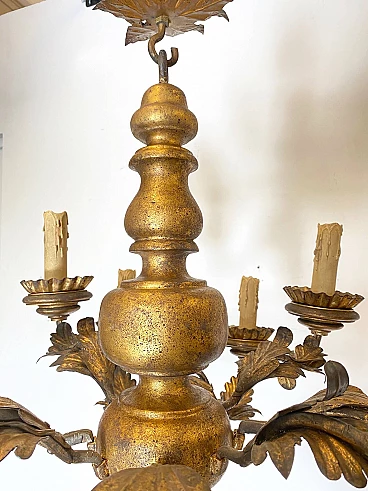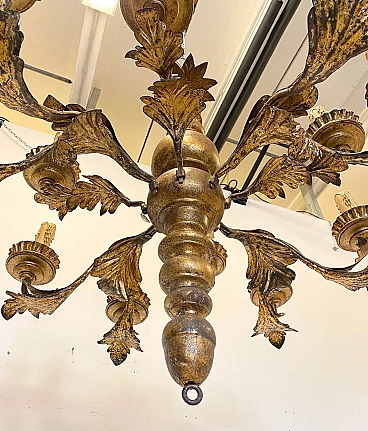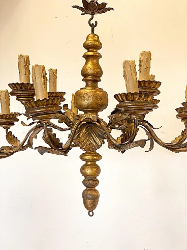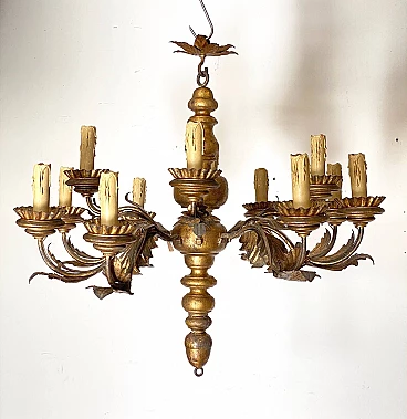 Antique chandelier from the early 1700s, central shaft in gilded wood, 8 arms in gilded iron alternating with single and double light, 12 lights in total, restored, needs a new electrical system