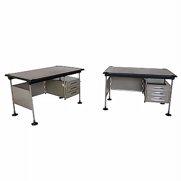 Pair of desks from Olivetti's Spazio series, one leg cap is missing and the skai top covering on one desk is missing.