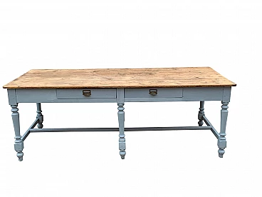 Spruce 6 leg table with 4 drawers, large size, fully restored, 2 original shell handles, and 2 non-original shell handles.