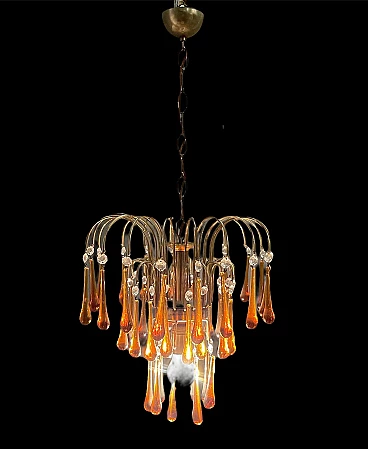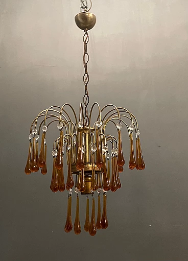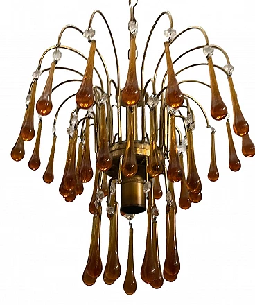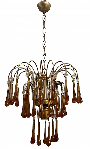 Waterfall chandelier with brass frame and hanging honey colored hand crafted Murano glass drops. Height without chain and ceiling canopy: 38cm. Requires 1 E27 light bulb, new wiring installed compatible with UK, Europe and US.