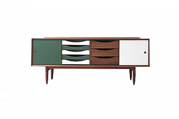 The sideboard is extremely versatile: the sliding doors, green lacquered on one side and teak essence on the other, are reversible, so as to transform the appearance of the furniture at will. There is a row of exposed drawers lacquered in white and green and another row of teak drawers.
