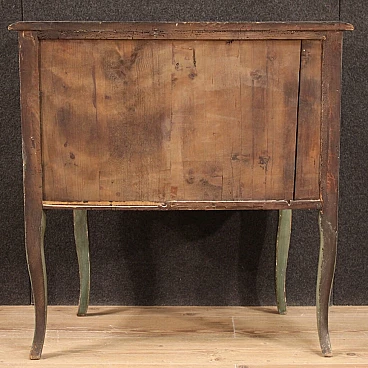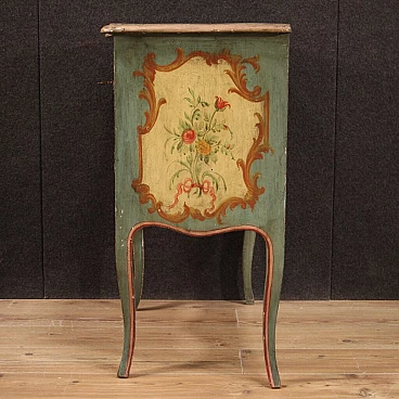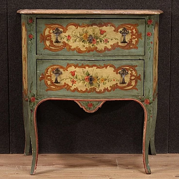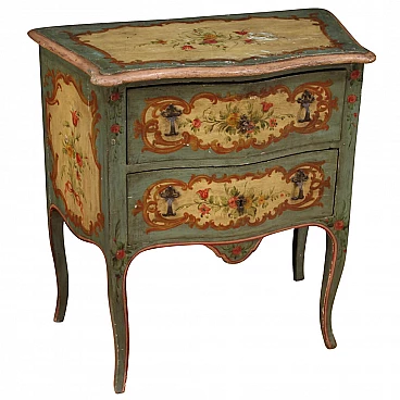 Small Venetian dresser of the mid-20th century. Carved wood mobile, lacquered and hand-painted with great pleasant floral decorations. Dresser with two front drawers of good capacity and upper wooden top in a lacquered and painted character (see photo). Plan that presents some stains and color falls (see photo). Structurally healthy furniture, of excellent proportion, easily inserted in different points of the house. Complete drawers of working locks (recently replaced) and a key. In discrete conditions and in a beautiful patina, it has some color falls.