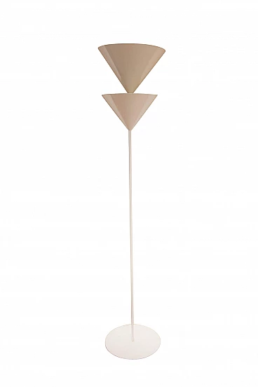 Lacquered metal floor lamp from the Pascal series, designed by Vico Magistretti for Oluce. The lower cone houses two e27 bulbs while the upper cone houses a halogen lamp.
