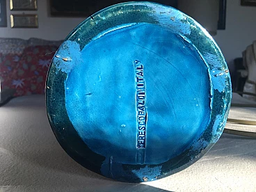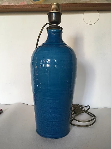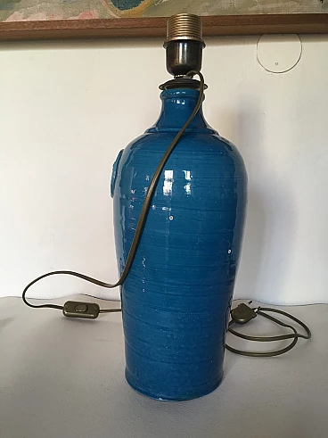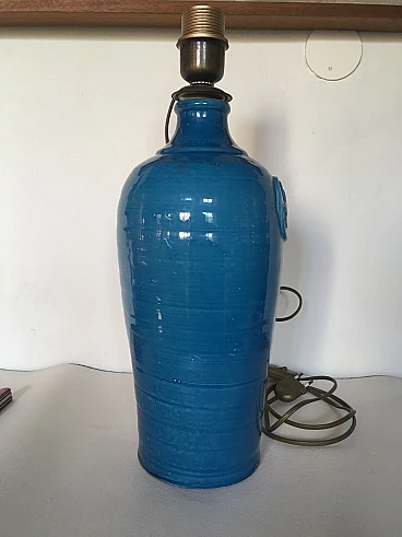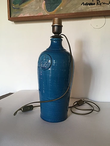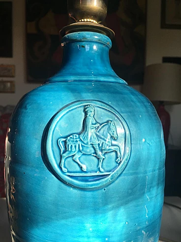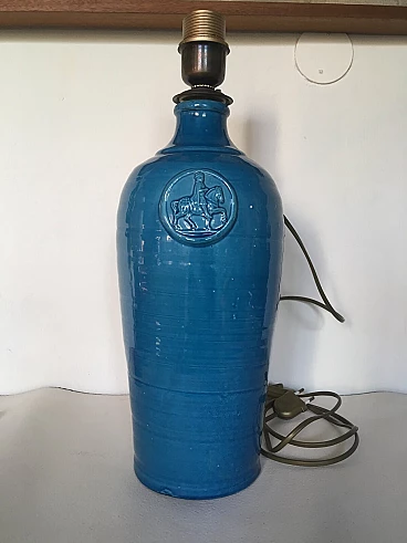 Beautiful table lamp made in Italy in the 1960s. Electrified Frescobaldi bottle for wine export (showing a medallion with rider on horseback), and blue ceramic. Lampshade missing.