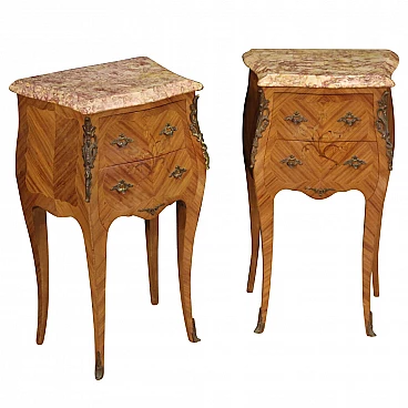 20th century French bedside tables. Furniture of a beautiful line and pleasant inlaid furniture in bois de rose woods, maple and fruit wood. Bedside tables equipped with two front drawers of discreet capacity and upper floor in good size marble and service (see photo). Chamber or living room tables, for antique and decorators, of excellent proportion. High leg bedside tables, adorned with chiseled bronze decorations (see photo). They present some small signs of time, structurally healthy, overall in good conservative state.