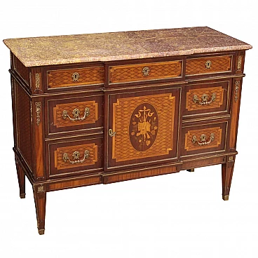 French dresser from the mid-20th century. High quality cabinet adorned with geometric inlay in mahogany, walnut, maple and fruit woods. Louis XVI style chest of drawers richly decorated with gilded and chiseled bronze and brass (see photo). Cabinet equipped with 7 drawers and a central door of good capacity, complete with a working key for all 8 locks. Original marble top, good size and service. Cabinet supported by 4 feet in the shape of a truncated inverted pyramid, of good solidity. Dresser for bedroom or living room, of pleasant decor, for antique dealers and interior designers. Central door adorned by inlay with musical instruments and floral decorations (see photo). In beautiful patina and in good state of preservation, with some small signs of time.