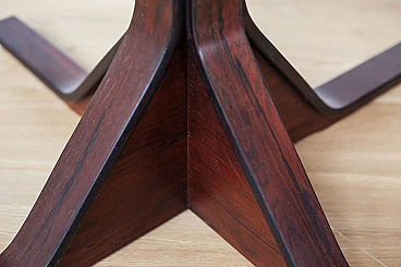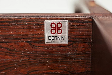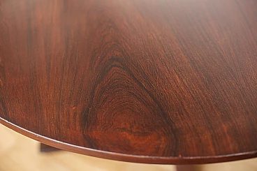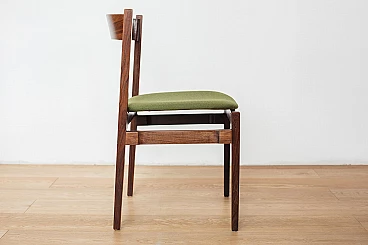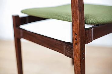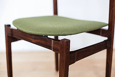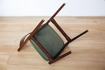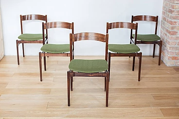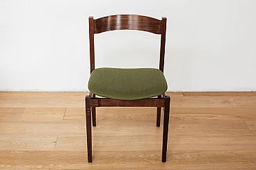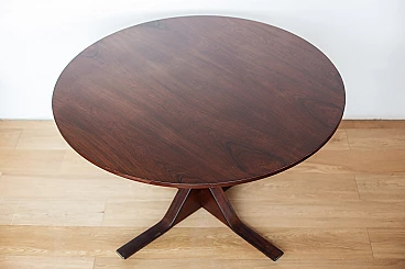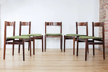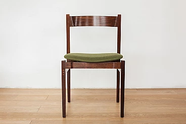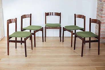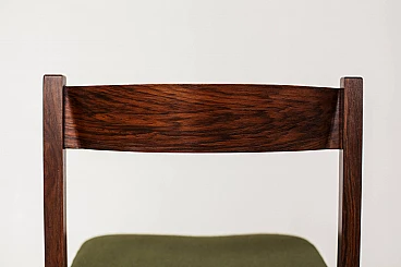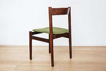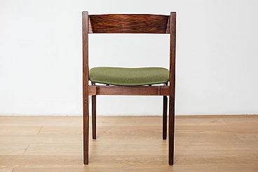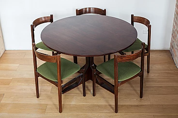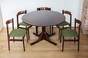 Rosewood round dining table, model 522, by Gianfranco Frattini for Bernini. Original manufacturer's trademark on the base. Set of 5 chairs model 101 by Gianfranco Frattini for Cassina. Restored rosewood frame and original green fabric seat, without any defects.