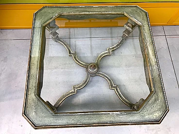 Elegant Louis XIV style lacquered and gilded coffee table and from the first half of the 20th century. The top, square in shape with corners "pan coupe", has a glass that rests, embedded, on a wideband lacquered with fillets painted. The latter allows, thanks to its transparency, to see the beautiful cross jagged at the bottom that connects the 4 legs to the balustrade, then connected at the top by a band fringed. The state of preservation is very good, the structure is healthy and firm, the glass has no chipping, the lacquer and gilding are in good condition with some inevitable signs of time with a leg and a crossbar with a red dripping possibly to be cleaned.