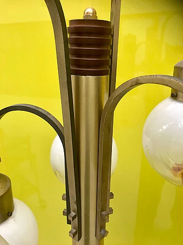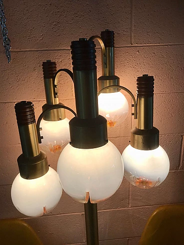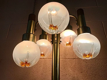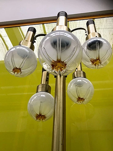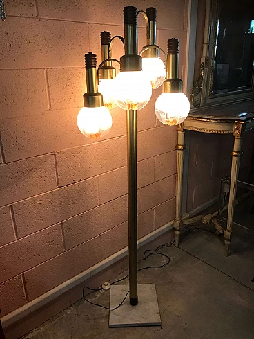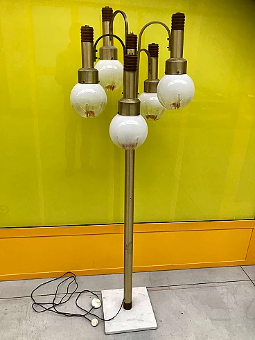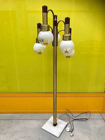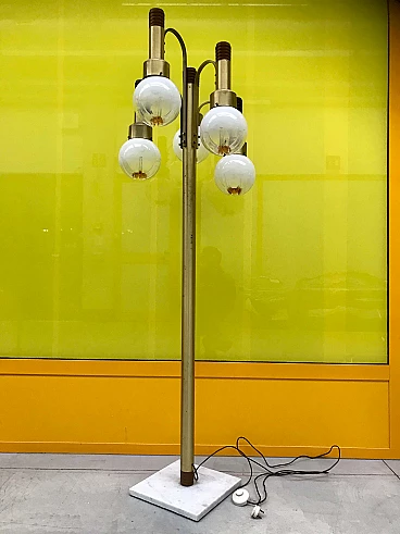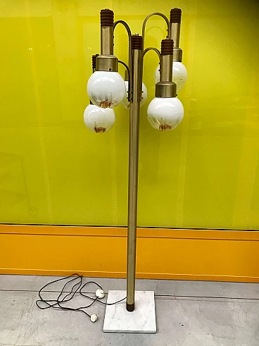 Waterfall floor lamp with 5 globular Murano glass lights, gilded brass stem, wood and marble base, original 60s - 70s