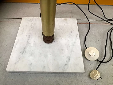 Beautiful and rare "waterfall" floor lamp with 5 lights with original Murano Glass globular shades from the 1960s / 1970s. The body is made of gilded Brass with 5,5cm high wood profiles at both ends of the body's tubes, the main body's, and the 5 tubes that support the lights. The base is in White Carrara Marble. The state of preservation is very good, with the brass structure, to be polished, with some signs of time on the gilding, the wooden profiles and marble impeccable, the electrical system, all original, working, with the wire, the foot button and the plug all coeval. Size diameter of the bowl 16 cm. about
