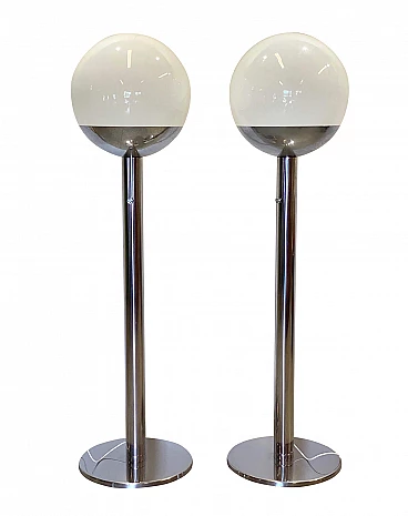 Pair of floor lamps 70 model P428 designed by Pia Guidetti Crippa for lights Italy, chromed steel structure, white glass diffusers, light variator that allows you to switch from white light to colored, supplied a red light bulb and a green